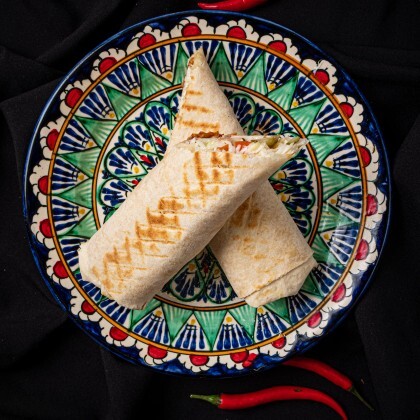 Лаваш, курица, соус чесночный, капуста, помидор, соленый огурец, кукуруза, халапеньо, перец чили